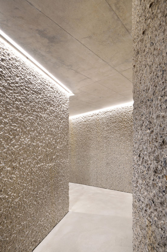 Die vertikale Erschliessung wird zum architektonischen Erlebnisraum: polygonale Treppenhäuser mit Lufträumen, Oberlichtöffnungen und roh belassenem, grob gespitztem Ortbeton verleihen dem Material eine sinnliche, fast landschaftliche Qualität. So wird das Schäfer Areal zur Verbindung von Tektonik, Materialität und Atmosphäre – ein architektonisches Statement im Zentrum von Dielsdorf.