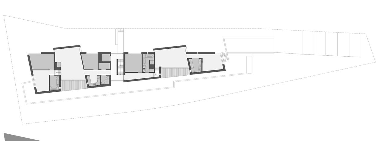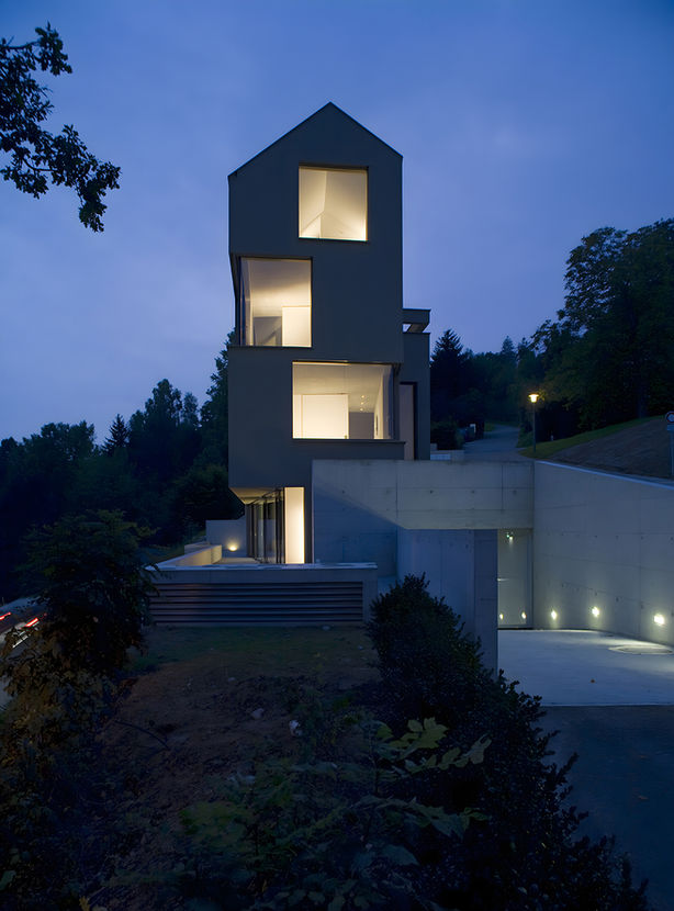 Der architektonische Entwurf der beiden Hausteile nimmt die einzigartige Panoramalage sowie den historischen Bezug zum Burgstädtchen Regensberg auf und übersetzt diese Qualitäten in eine zeitgemässe Formsprache. Jeweils drei Wohnungen pro Haus zeichnen sich durch individuelle Grundrisse, Höhenstaffelungen und Proportionen aus, wobei das Wohnzimmer als zentrales Element mit einer Raumhöhe von 3,4 Metern und raumhohen Verglasungen nach Süden beeindruckt. Ein spannungsvolles Wechselspiel entsteht durch die Kontraste zwischen den verwinkelten, „burgig“ anmutenden Privaträumen und den lichtdurchfluteten, grosszügigen Wohnbereichen. Die konsequente Anwendung von Höhenversätzen ermöglicht in den Dachwohnungen vertikal orientierte Raumkonzepte, bei denen die Zimmer halbgeschossig zum Wohnraum versetzt sind. Während die südseitigen, teils übereck verglasten Bandfenster eine spektakuläre Weitsicht bieten, zitiert die „burgige“ Nordfassade mit schmalen, „Schiessscharten“-artigen Fenstern die historische Architektur Regensbergs und sorgt für eine harmonische Einbindung in das Ortsbild.